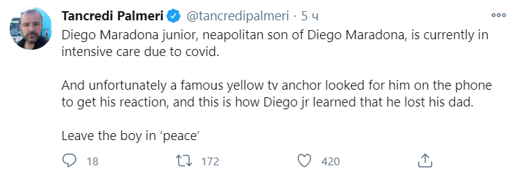 Также он отметил, что один из представителей "желтой прессы" нашел Диего Марадону-младшего по телефону, чтобы узнать его реакцию на трагическую весть, которая прогремела на весь мир.