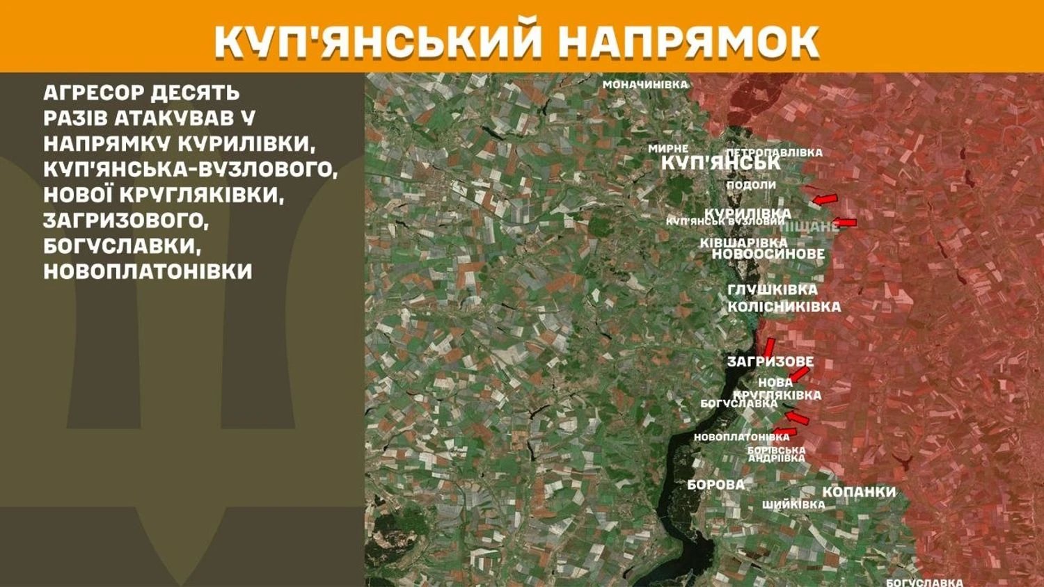 На Куп’янському напрямку агресор десять разів атакував у напрямку Курилівки, Куп’янська-Вузлового, Нової Кругляківки, Загризового, Богуславки, Новоплатонівки.