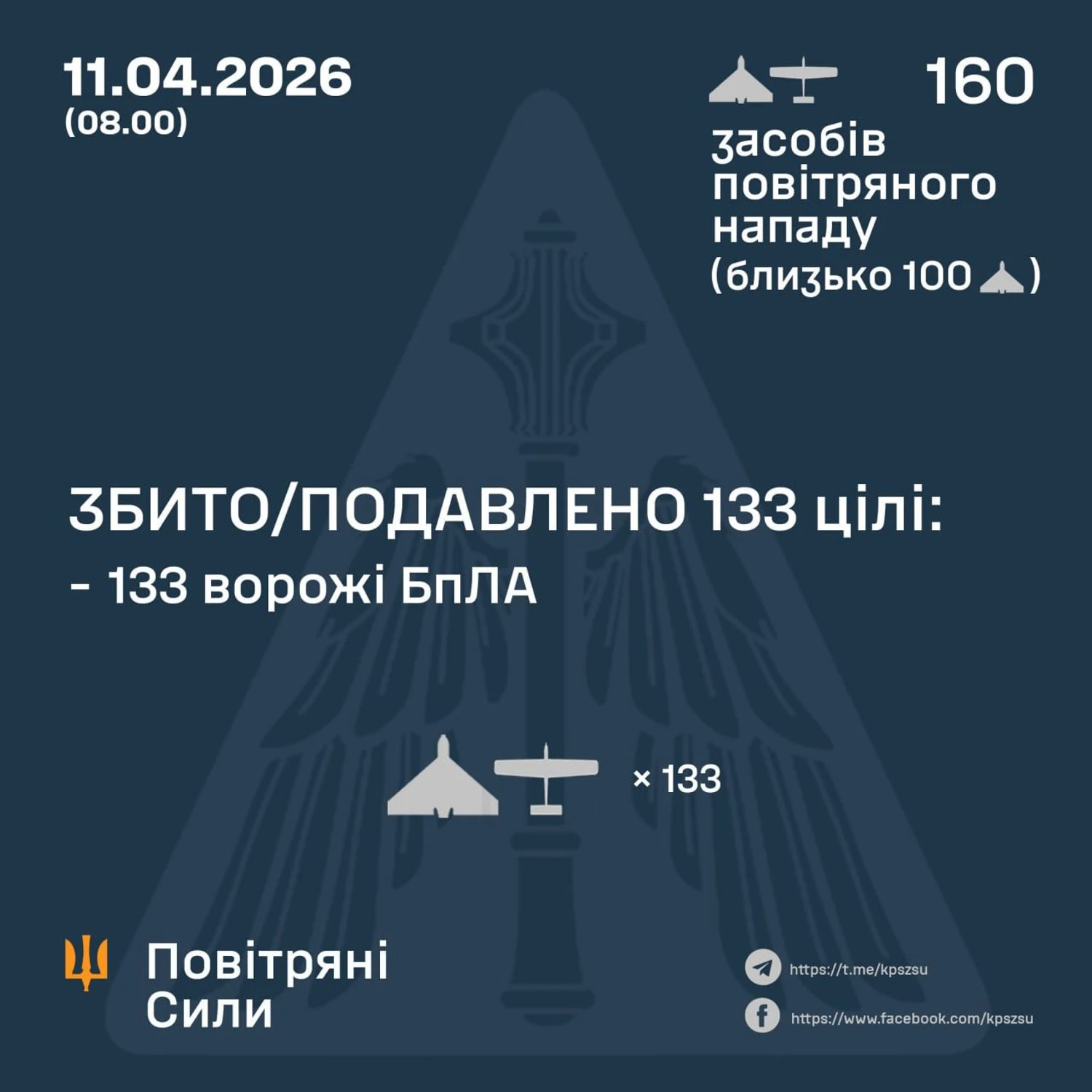 У ніч на 11 квітня ворог атакував Україну 160 ударними БПЛА типу Shahed, Гербера, Італмас та безпілотниками інших типів. Про це повідомляє УНН з посиланням на Повітряні сили Збройних сил України.
